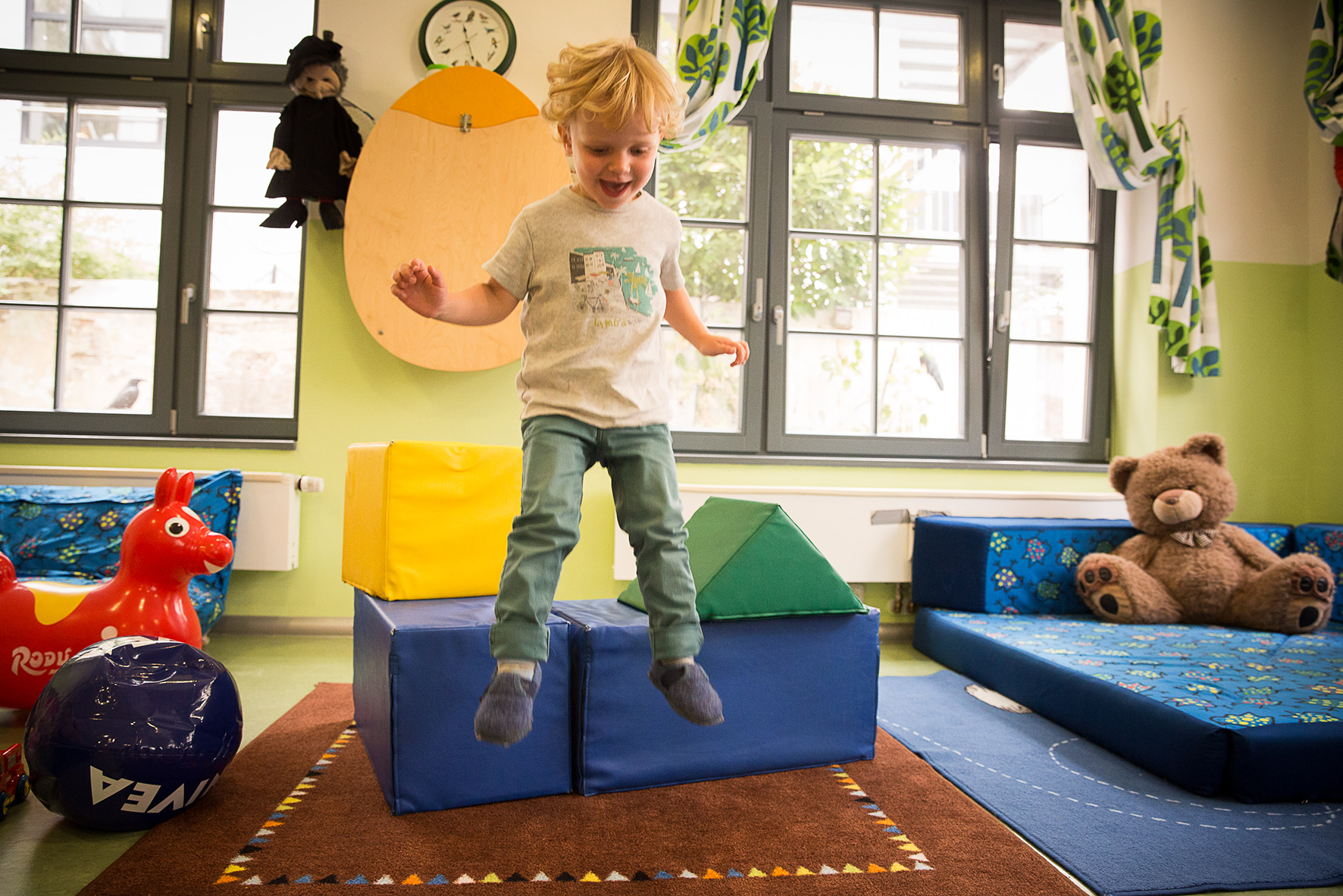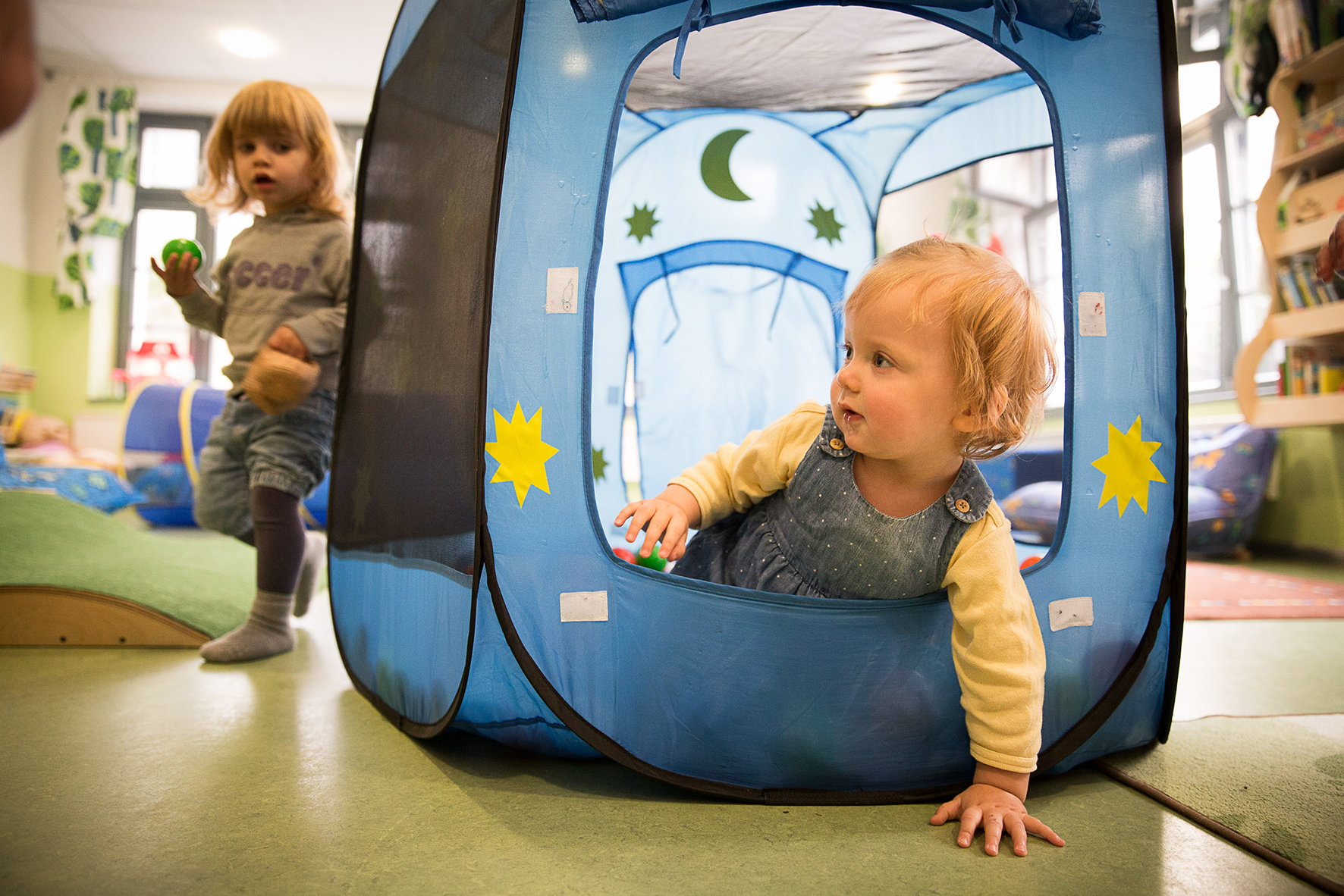 Uns ist es wichtig, dass die Kinder viel Zeit mit freiem Spiel verbringen können. Besonders gerne wird bei uns gesungen, getanzt und getobt. Aber auch die Zeit zum Bücher betrachten, Kuscheln oder Beobachter sein hat einen festen Bestandteil im Tagesablauf. Tuschen, kneten, basteln, puzzeln – das sind Aktivitäten, die wir den Kindern immer mal wieder anbieten und die mit Begeisterung aufgenommen werden.